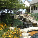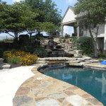 This finished project required a pool installation, a waterfall construction and landscaping for the surrounding area including pathways with natural rocks and flower planting. Have a look at the final product:
