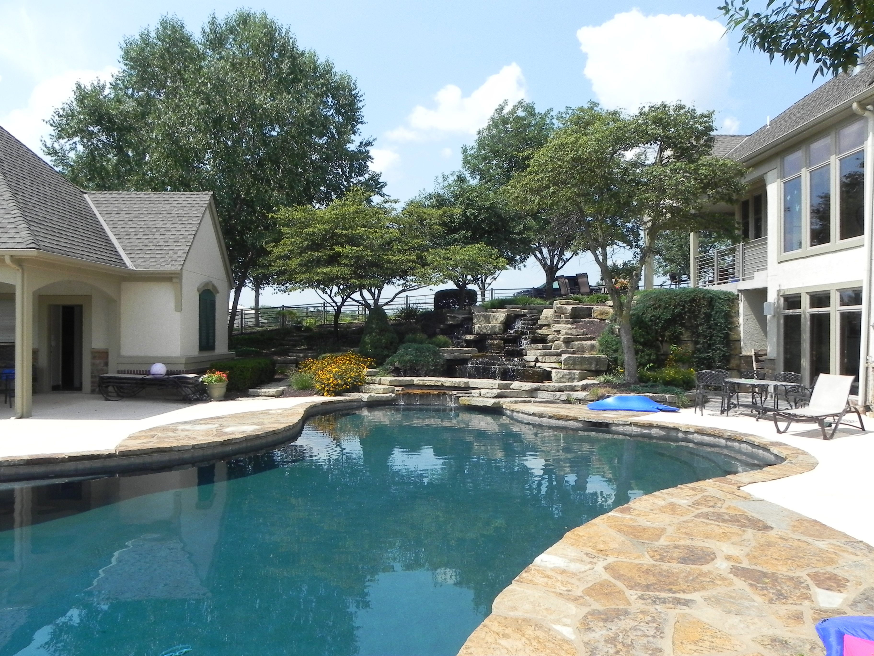 This finished project required a pool installation, a waterfall construction and landscaping for the surrounding area including pathways with natural rocks and flower planting. Have a look at the final product: